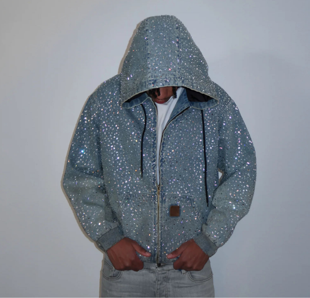 Jaket Denim: Pilih jaket yang sesuai dan dalam keadaan baik. Jaket berwarna lebih cerah cenderung memberikan kontras yang lebih menarik untuk rhinestones.